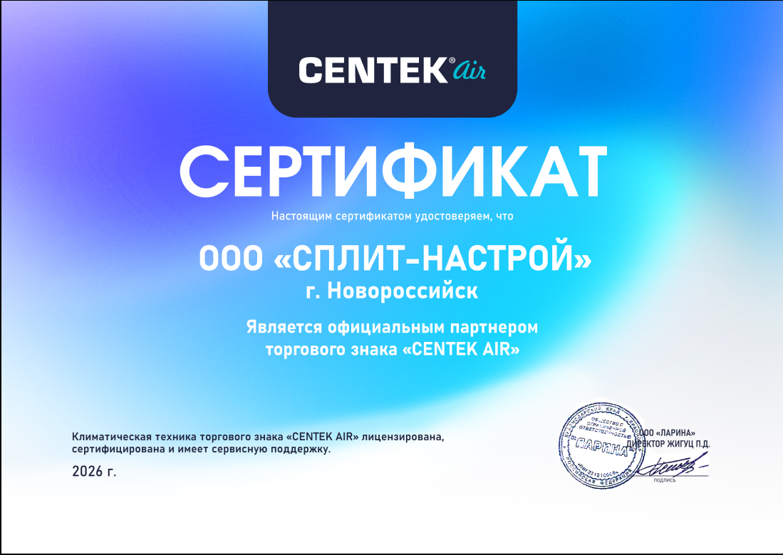 3 года гарантия от производителя CENTEK. 3 сервисная гарантия от климатической компании Сплит-Настрой.